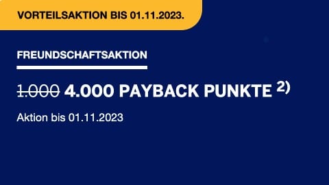 Nur bis zum 01.11.2023 mit 4.000 Payback Punkte gratis zum Start. Kartenvorteile: Dauerhaft keine Jahresgebühr, Zahlen und Punkten mit einer Karte, 1 Extra-Punkt je 3 Euro Umsatz bei jeder Kartenzahlung, Eine Zusatzkarte inklusive